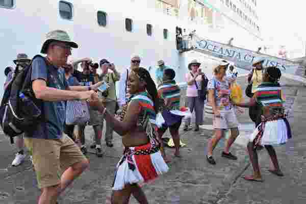 This photo should have been taken at Jomo Kenyatta International Airport with a Kenya Airways Aircraft in the background but not of a cruise liner that has just docked in one of the harbors somewhere along the Africa coat.