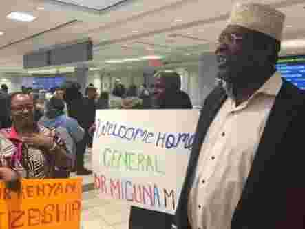 A group of Kenyans living in Canada on Thursday turned up at Toronto International Airport to welcome National Super Alliance's National Resistance Movement (NRM) self-declared general Miguna Miguna.