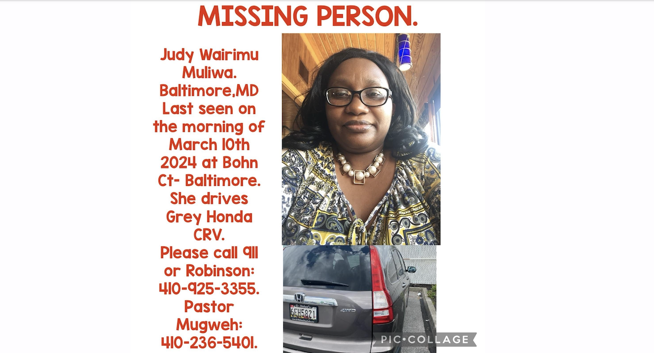Judy Wairimu Mliwa, 46, was last seen on the morning of March 10, 2024 at Bohn Court in Baltimore. She drives a gray Honda CRV.