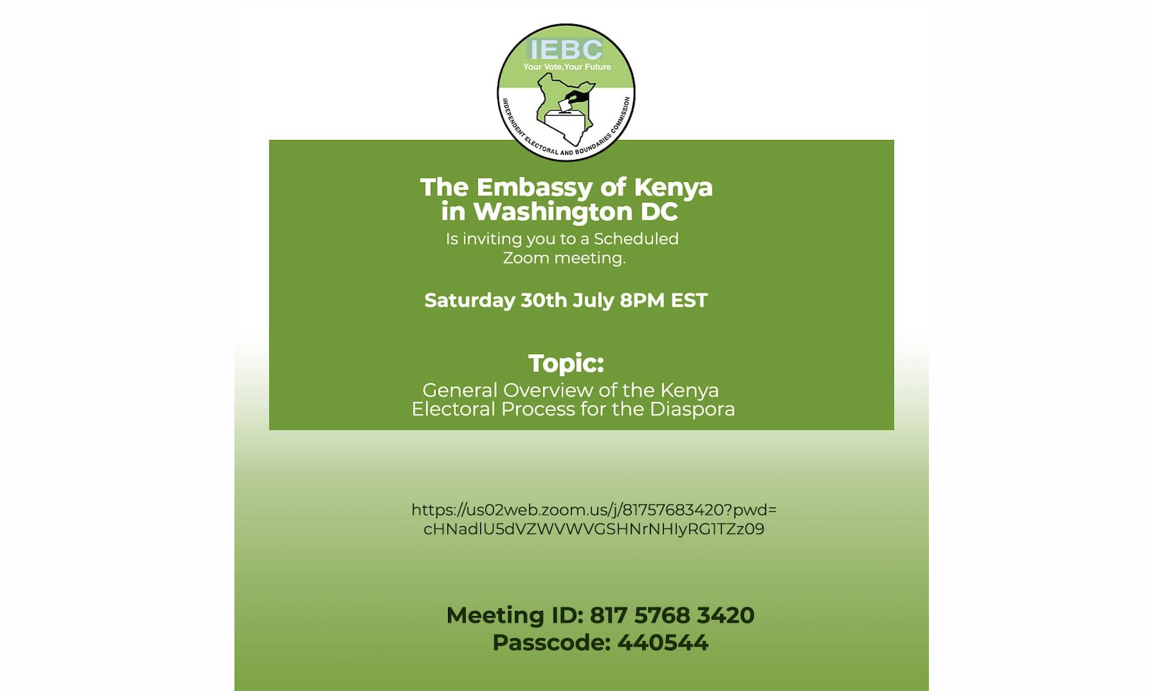 Kenya Embassy in Washington invites You to a Zoom Meeting on the Overview of Electoral Process for the Diaspora: Sat, July 30th