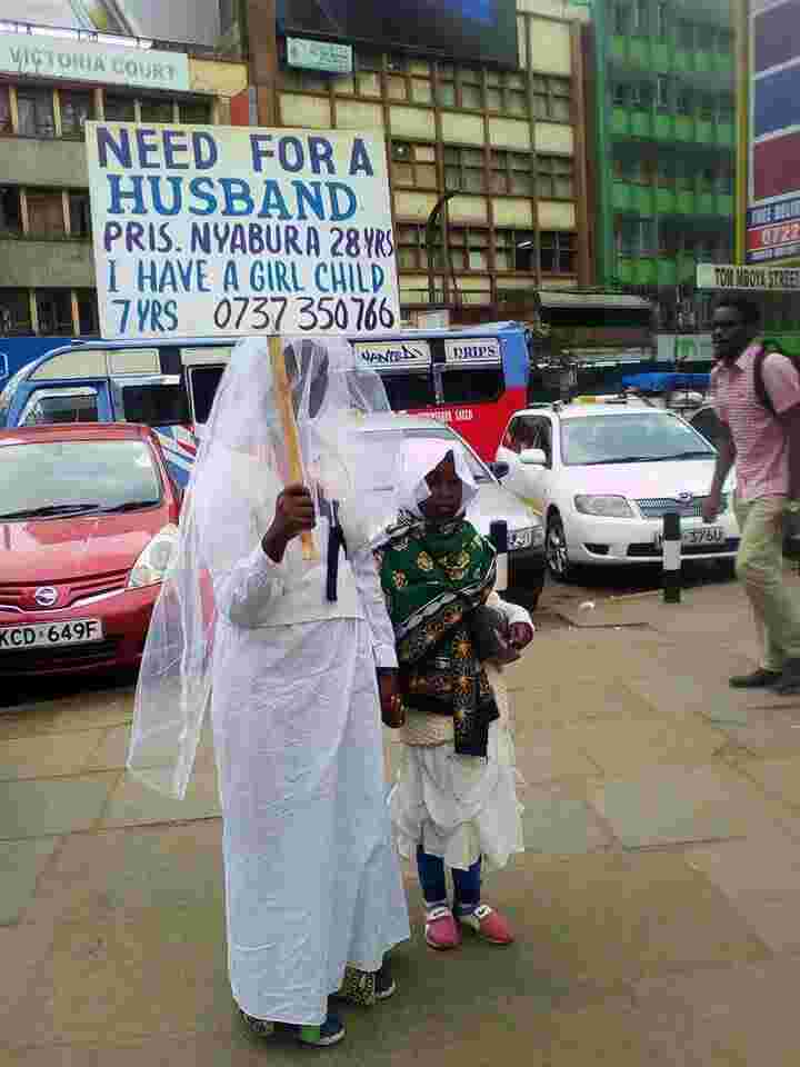 Nairobi residents were on Tuesday to a rare dramatic incident after a middle-aged woman paraded herself along busy city streets carrying a printed placard announcing she was looking for a husband.