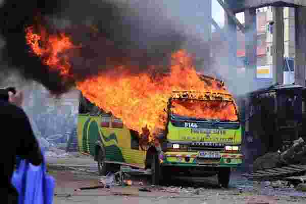 A minibus operating under Forward Travellers Sacco, a lorry belonging to police and two pull carts were torched outside Burma Market along Jogoo Road. Police used teargas and live bullets to disperse the huge crowd and occasionally sprayed the masses using water canons but the Nasa supporters remained resilient.