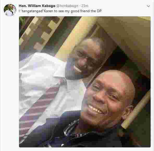 Taking to Twitter after he paid Deputy President William Ruto a visit at his Karen home in Nairobi on Monday morning, Kabogo tweeted: “I “tangatangad” Karen to see my good friend the DP."