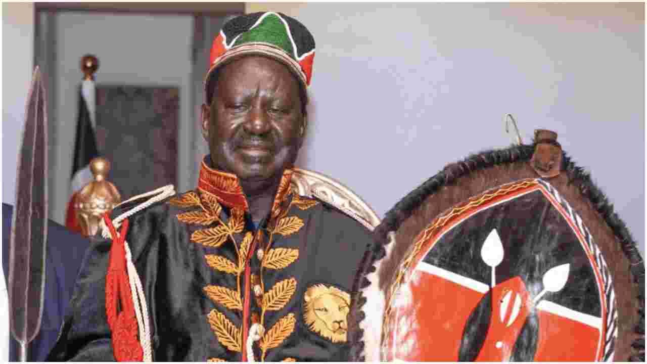 During the star-studded event, Raila sat on a gold and red ‘throne’ with a footstool. He wore a two-piece suit over a black animal skin cloak with the Kenyan flag’s colors on the heming, a Kufi cap, and a ceremonial spear.