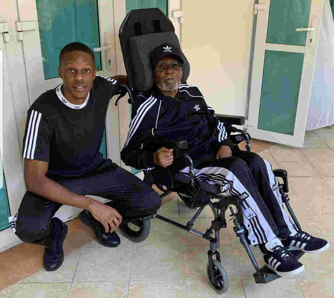 In the photo, Robert Junior is posing beside his father, who is seated on a wheelchair and wearing an Adidas sportswear including a cap, jacket, pants, and shoes.
