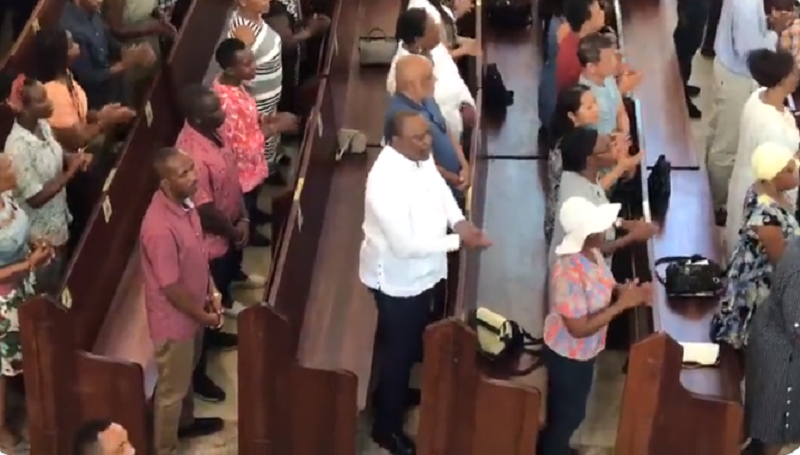 Videos shared on social media show Kenyatta and his family members seated among worshippers singing, kneeling, and praying during mass.